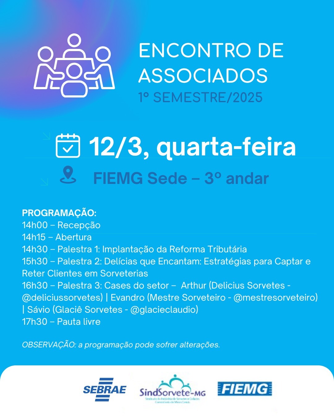 Em 2025, o Sindsorvete-MG realizou o Primeiro Encontro de Associados, um momento dedicado a fortalecer o relacionamento entre as empresas do setor, promover integração e ampliar o diálogo sobre os desafios e oportunidades da indústria de gelados comestíveis em Minas Gerais.