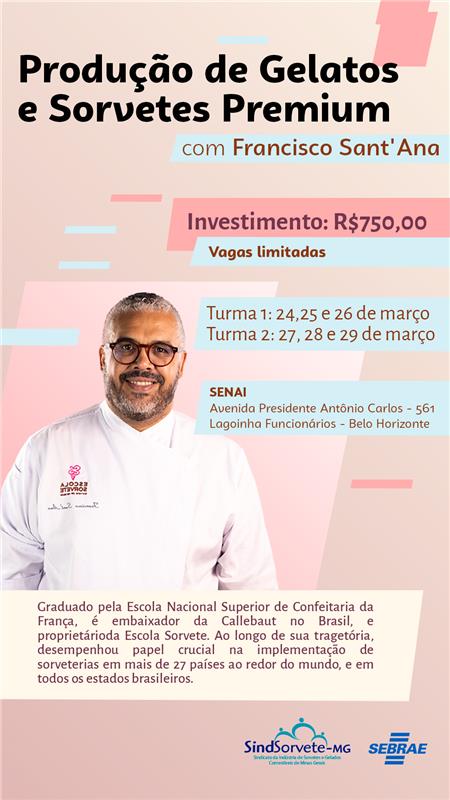 Em março de 2025, o Sindsorvete–MG, em parceria com o Sebrae e o SENAI, realizou o curso Produção de Gelatos e Sorvetes Premium, ministrado por Francisco Sant’Ana, um dos maiores especialistas do setor no Brasil e no exterior. A capacitação teve como objetivo promover o aperfeiçoamento técnico de profissionais e empreendedores da cadeia de sorvetes, com foco nas tendências e práticas do mercado premium.